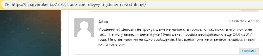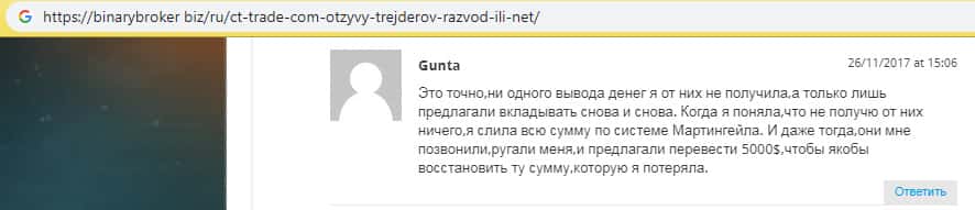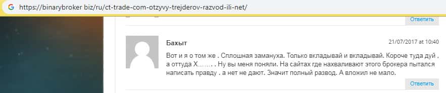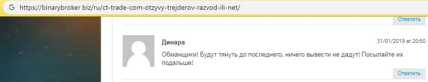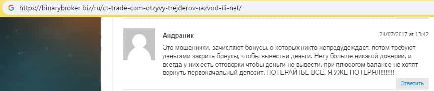 Отказ выводить средства - самая распространенная черта лохотронов и мошенников, которая есть и у жуликов Credo Trade, которые даже в случае отказа клиентом торговать все равно не будут выводить любую сумму средств. На изображении ниже вы можете увидеть комментарий о работе с лохотроном Кредо Трейд.