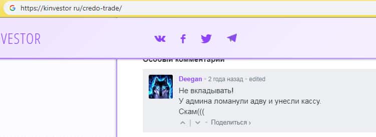 Довольно много обманутых мошенниками Credo Trade пользователей сети предупреждают о обмане лохотрона. На изображении, расположенном ниже, вы можете увидеть еще один такой комментарий в сторону аферистов Кредо Трейд от облапошенного трейдера, который решил оставить свое предупреждение для остальных трейдеров.