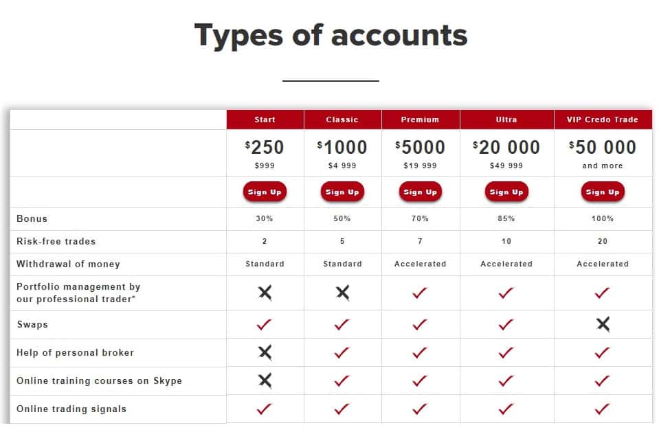 После лохотрон Кредо Трейд приводит перечень своих тарифов, в перечень которых входит анализ и помощь, которые являются отличной мотивацией для уговоров клиента ввести реальные средства на торговые счета мошенников Credo Trade. Всеми силами пытаются вытянуть больше денег с наивных клиентов.