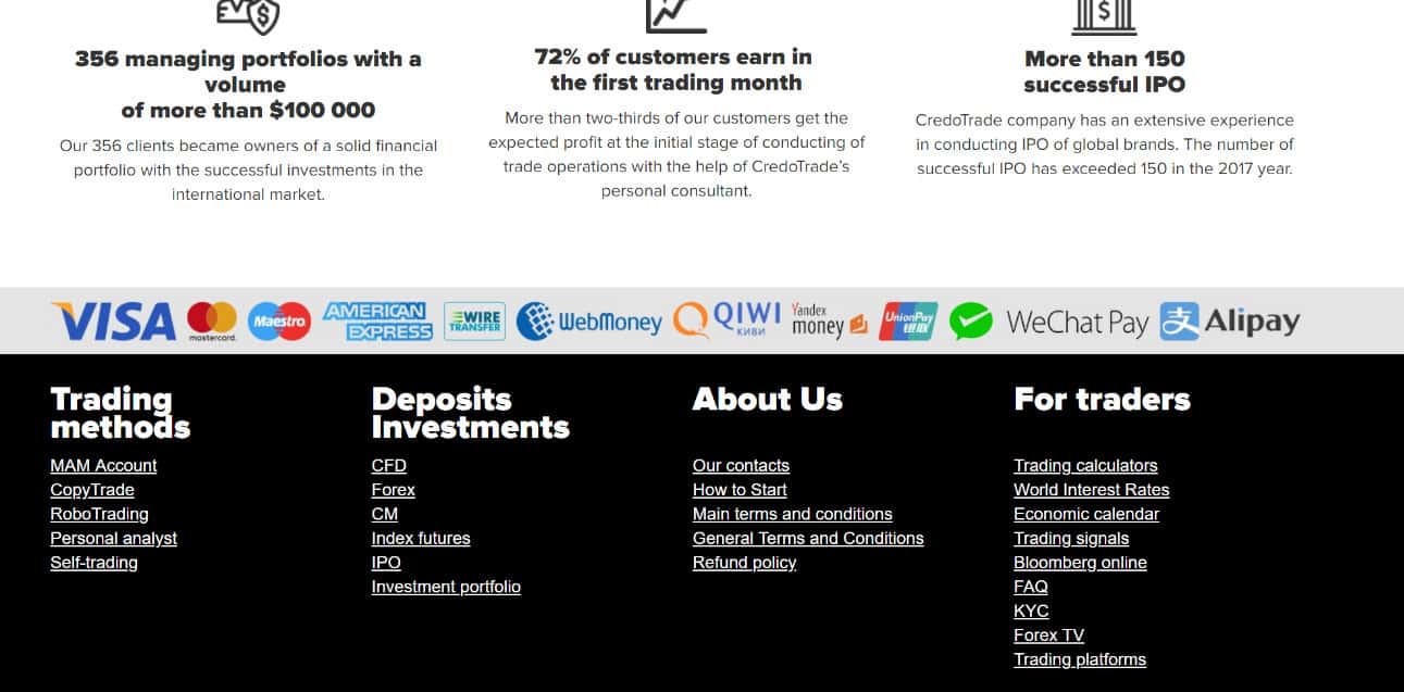 Начинается сайт у мошенников Кредо Трейд с типичной шапки сайта, в которой аферисты кривовато начинают вешать лапшу на уши своим клиентам по поводу успешности своего кривого и подвального мошеннического предприятия по разводу честных трейдеров. На изображении, расположенном ниже, вы можете увидеть сайт жуликов Credo Trade.