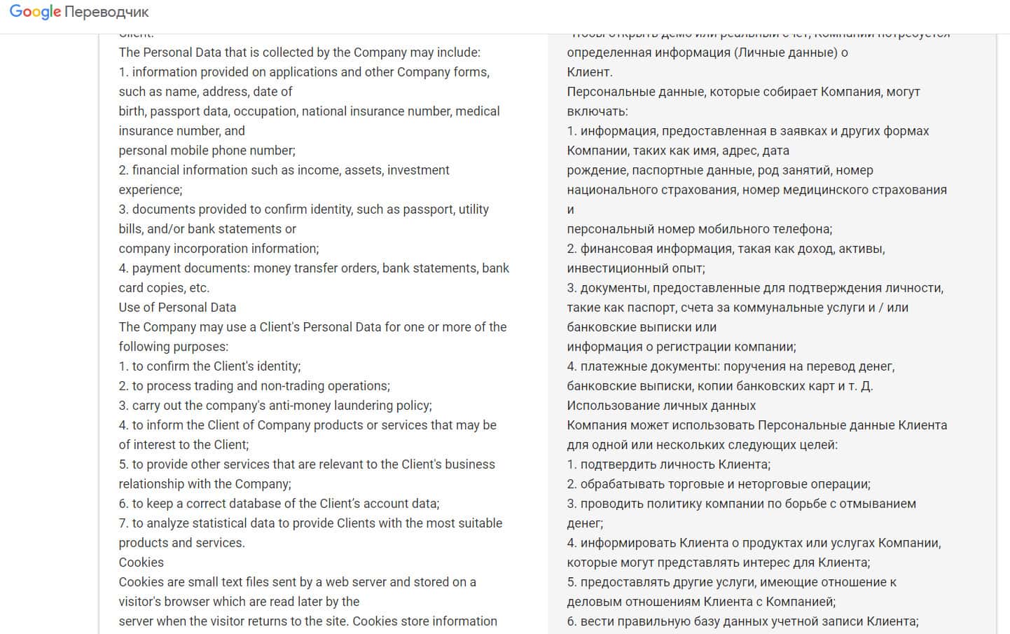На скриншоте, расположенном ниже, показан переведенный раздел политики, которые содержат в себе воду о жульничестве конторы Credo Trade и о том, какую информацию им должны предоставлять пользователи для того, чтобы без труда проводить аферы на подвальном сайте Кредо Трейд.