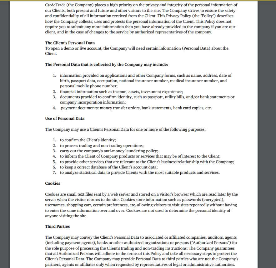 Условия политики конфиденциальности лохотрона Кредо Трейд