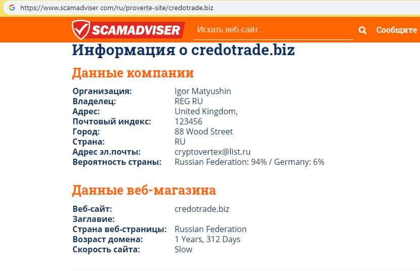 В связи с мошеннической и противозаконной деятельностью лохотрона Кредо Трейд его реальные руководители предпочитают анонимность дабы избежать ответственности со стороны правоохранительных органов. Техническую же информацию о сайте жулья Credo Trade можно узнать с помощью портала scamadviser com, что вы можете увидеть ниже.