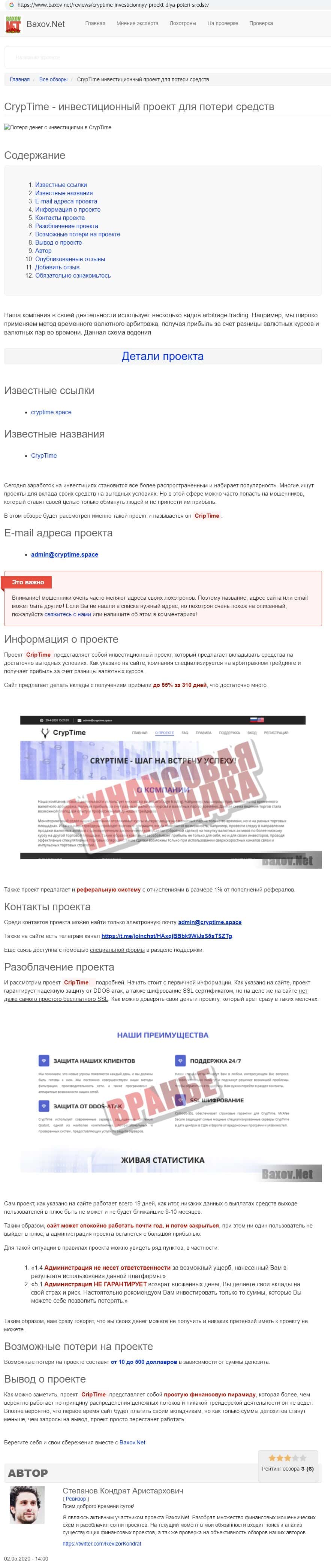 По мнению портала baxov net проект CripTime представляет собой финансовую пирамиду, которая распределяет денежные потоки и никакой трейдерской деятельности он не ведет.