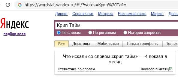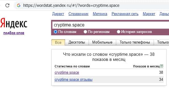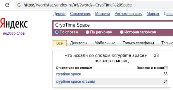 Исходя из анализа показателей портала cryptime space, становится предсказуемым низкий уровень количества поисковых запросов данного бренда в поисковой системе Яндекса.