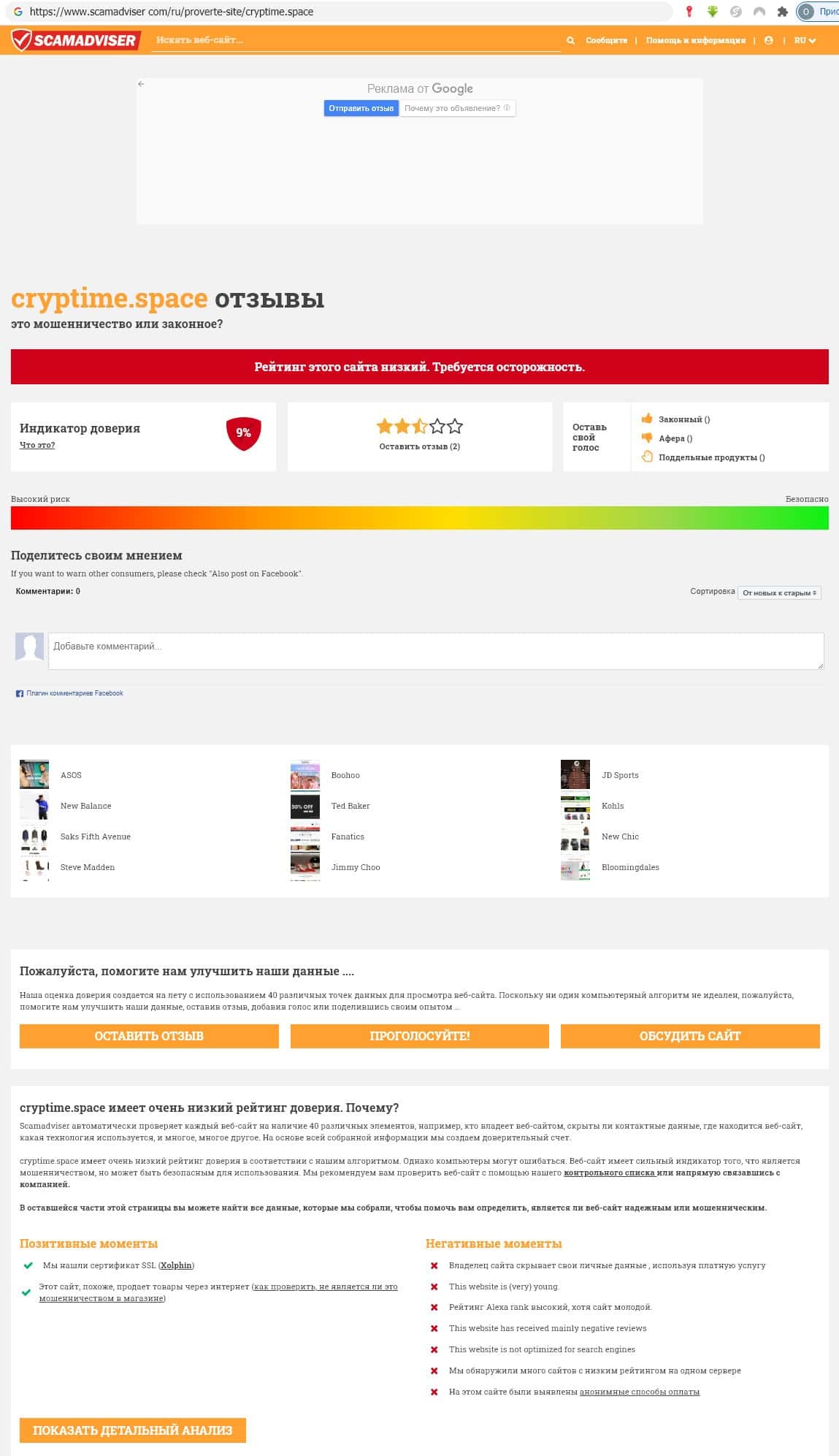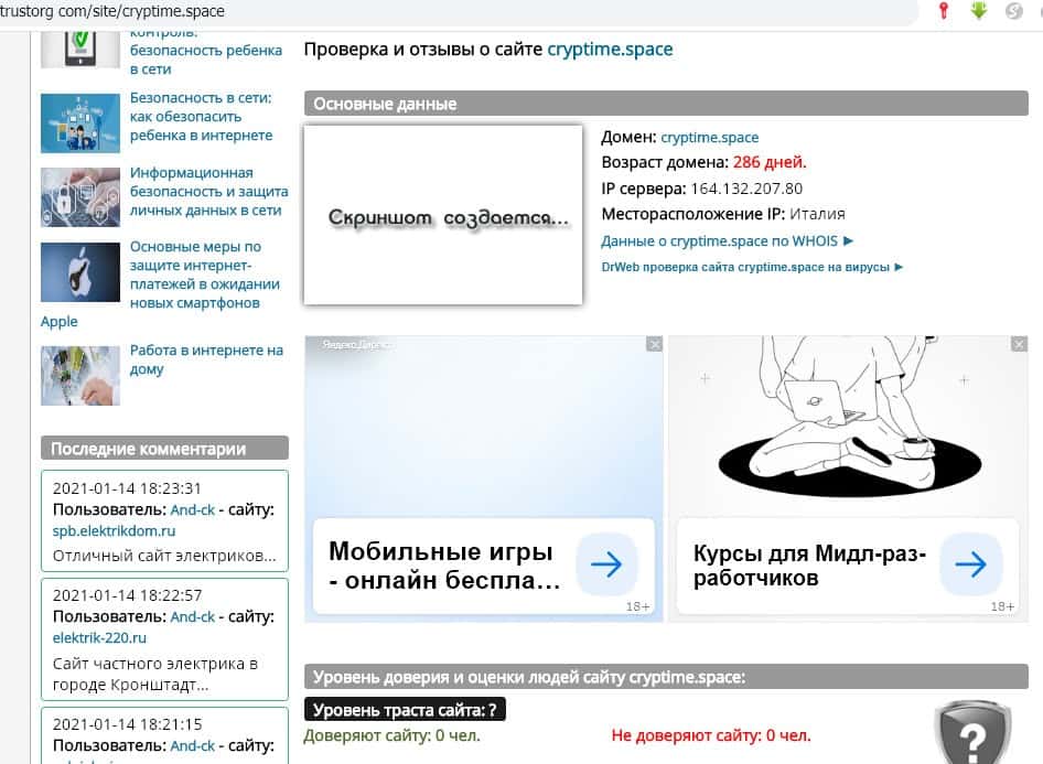 Портал scamadviser, проанализировав информацию о портале Крип Тайм, не рекомендует доверять этому жульническому ресурсу на основании ряда его негативных характеристик.
