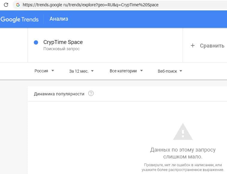 А в английской транскрипции бренд "CrypTime Space" так же толком никто не ищет, и о его адекватном анализе на поисковой системе Google тоже речи не идет.