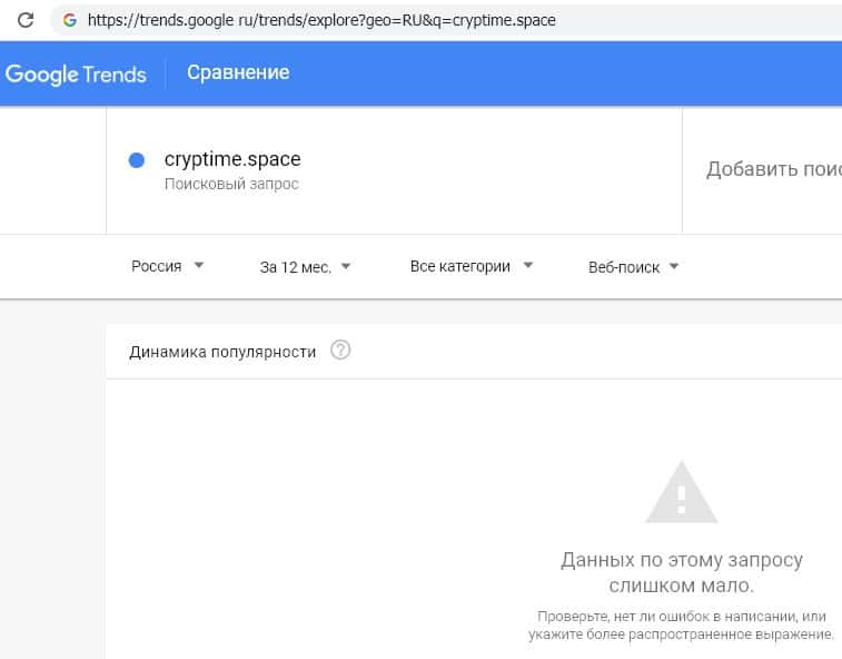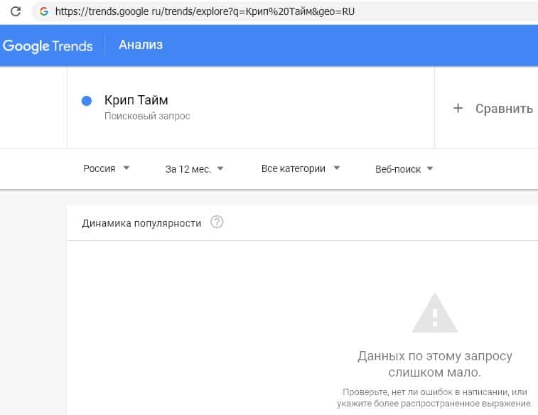 Американская поисковая система Google показывает, что у неё слишком мало данных для анализа популярности бренда "Крип Тайм" посредством поисковых запросов.