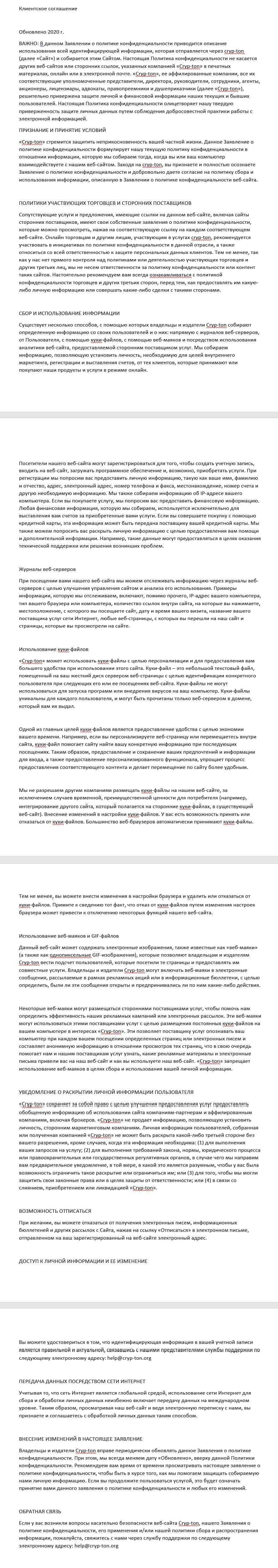 Мошенники Сryp-Тon Оrg просто скопировали документ Политика конфиденциальности и вставили его под названием Клиентское соглашение, так как им было лень писать его.