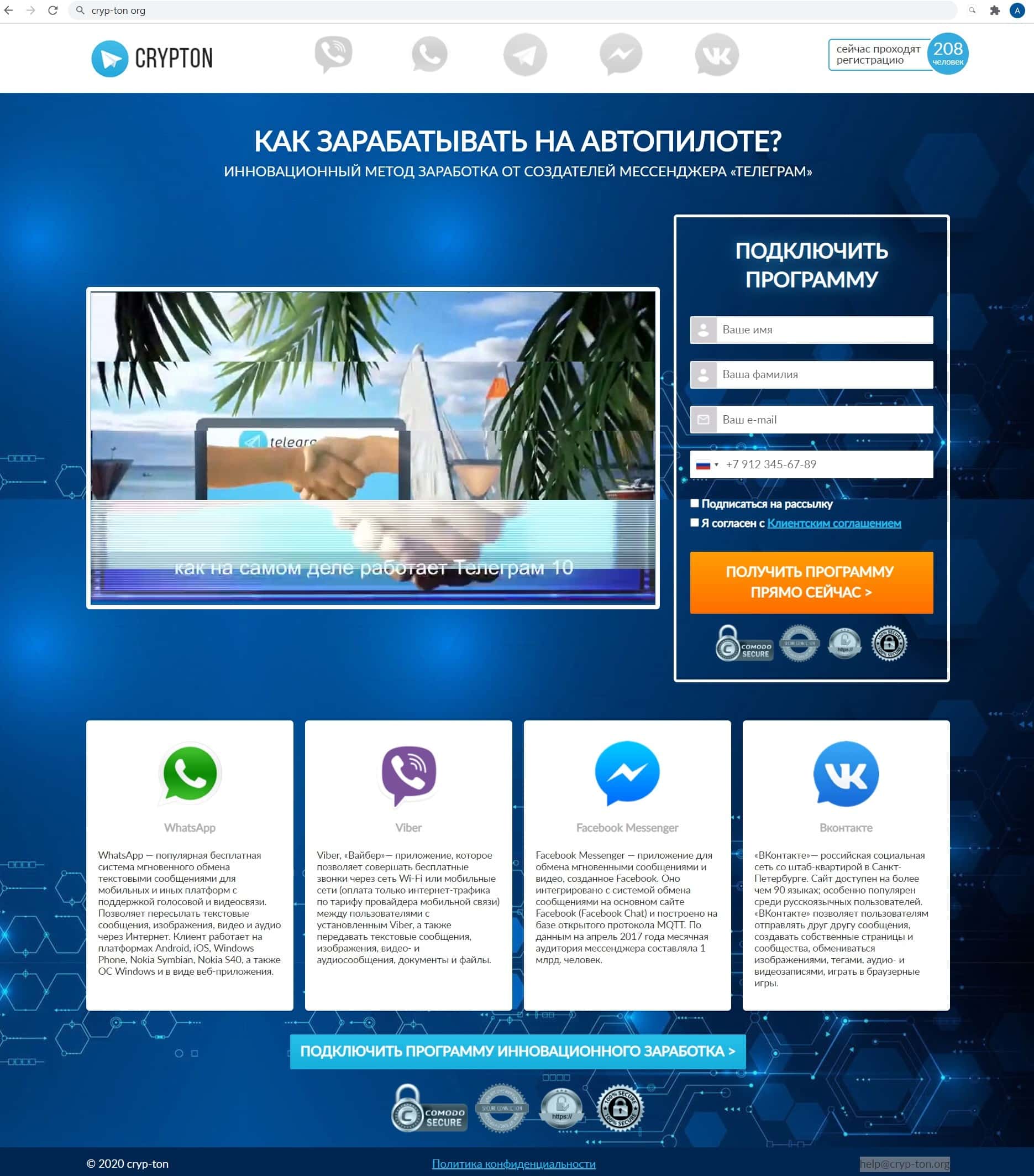 Крип Тон - Это шулерский проект, основанный на модной теме зарабатывания денег в интернете. Создатели этого лохотрона используют имя Дурова для того, чтобы привлекать клиентов на свой сайт. Жулики предлагают пользователям приобрести некую программу, торгового робота, который будет зарабатывать для вас деньги, пока вы сидите на диване. Ничего нового, обычный развод на деньги. Почти полное отсутствие контактов на сайте говорит в пользу той версии, что это типичное кидалово. Также мы не видим ни имени владельца, ни адреса компании. Не рекомендуем связываться с мошенниками Сryp-Тon Оrg, которые охотятся за вашими деньгами!