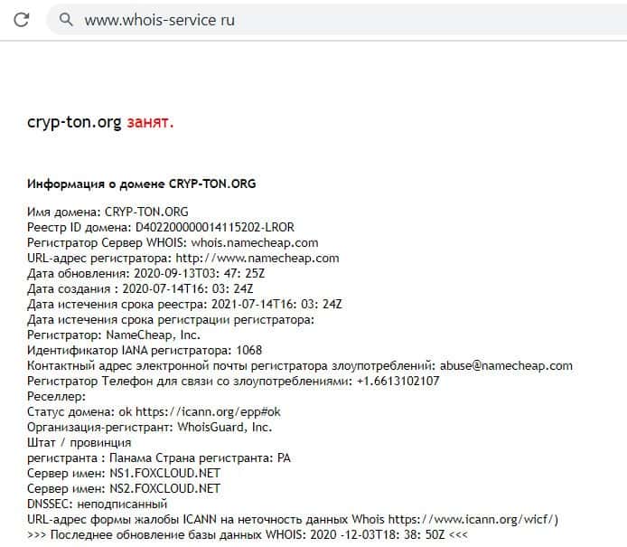 Кому принадлежит доменное имя сайта cryp-ton org, выяснить не удалось, так как регистрант скрыл свою организацию. Это признак того, что данная компания - лохотрон.