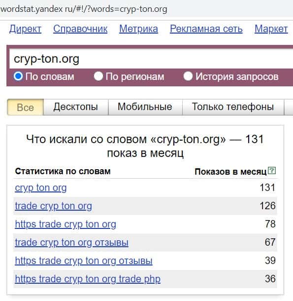 - Количество брендовых запросов в поисковике Яндекс Вордстат по Сryp-Тon Оrg