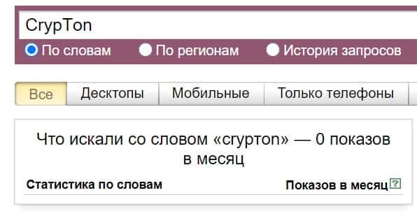 Название бренда "СrypТon"на английском языке пользователи не пытались найти в системе Яндекс ни разу, результат нулевой.
