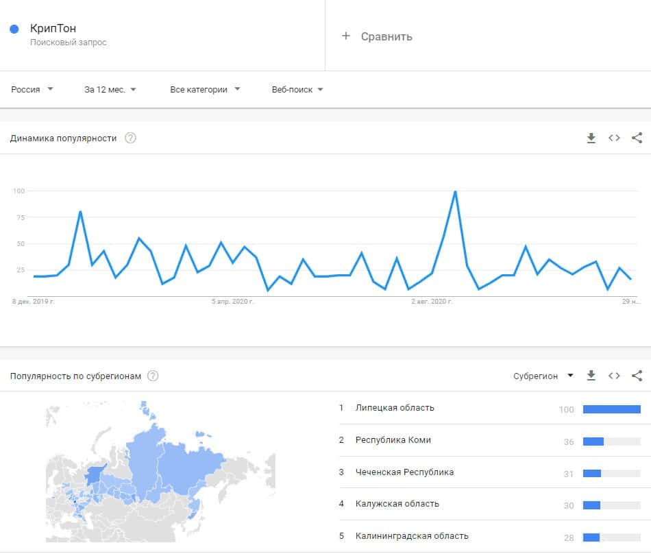 Название бренда "КрипТон" на русском языке люди искали в системе Гугл жители Чечни, Липецкой области, Коми, Калужской и Калининградской областей.