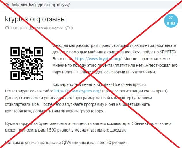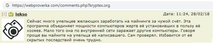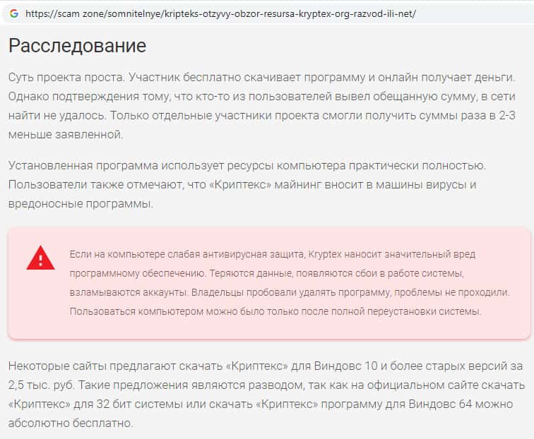 На веб-сервисе вебпроверка ком замечен комментарий о псевдо-заработке на сайте Kryptex Org. Эта программа объединяет мощности компьютеров тех, кто ее установил, за счет чего аферисты Криптекс хорошо зарабатывают. Чаще всего устройство, на которое была скачана программа, сгорает и перестает работать.