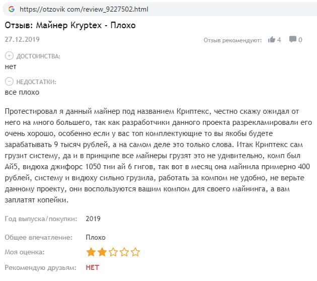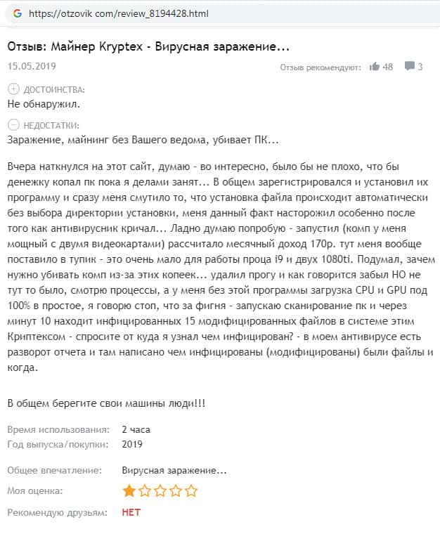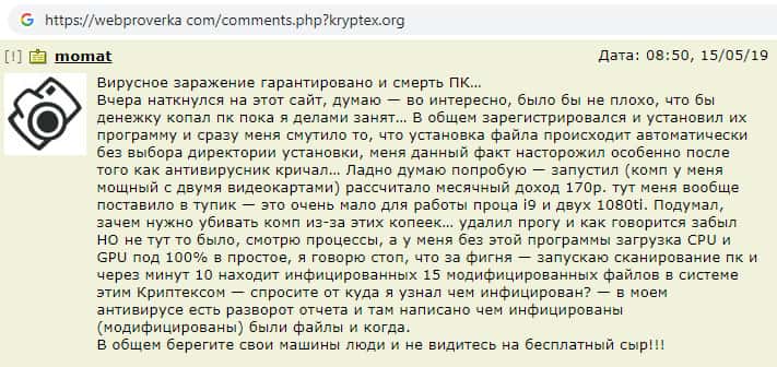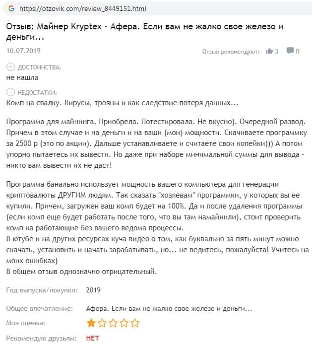 На веб-ресурсе отзовик ком обнаружен отзыв о майнере Криптекс. Автор данного комментария уверен в том, что в следствии использования такой программы ничего хорошего не получится. Компьютер заражается вирусами, следствие чего потеря данных. Так же очень часто возникают случаи, когда сгорает процессор.
