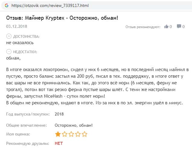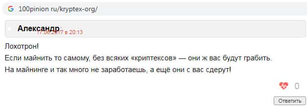 На сайте-отзовике otzovik com отыскан отзыв о мошенниках Kryptex Org. Автор данного отзыва пишет, что их программа не достойна такого пристального внимания, как они сами себя разрекламировали. Это всего лишь навсего ловушка для лохов, где аферисты зарабатывают деньги за счет мощности компьютера, на который была скачана программа.