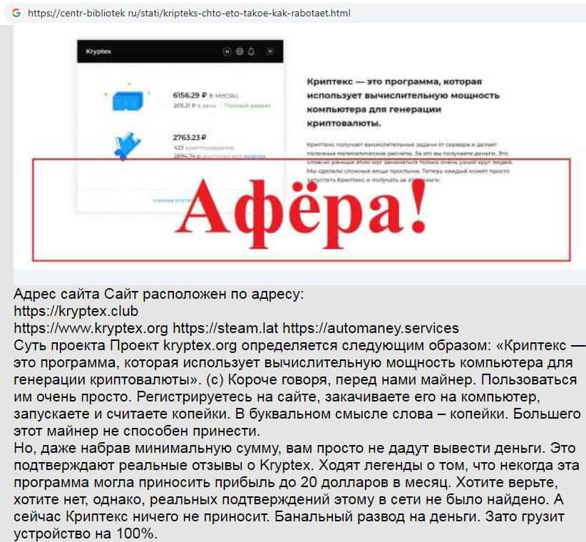 На веб-ресурсе centr-bibliotek ru замечена статья о мошенниках Kryptex Org. Программа, которую они рекомендуют скачать для якобы майнинга, использует вычислительную мощность компьютера и не приносит никаких доходов. Аферисты Криптекс в любом случае не дадут Вам снять свои деньги со счета !!!