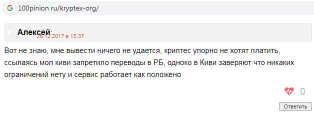 На веб-ресурсе 100пинион ру обнаружен отзыв о мошеннической организации Криптекс. Автор отзыва предоставленного на скриншоте ниже, некий Алексей пишет, что шулера отказываются выплачивать ему денежные средства, ссылаясь на то, что Qiwi запретило, но на самом деле никаких ограничений нет.