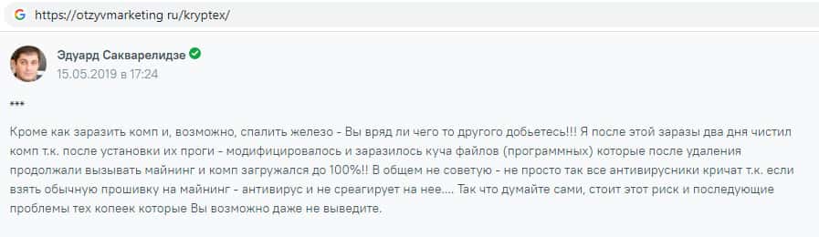 На сайте-отзовике otzyvmarketing ru отыскан отзыв об аферистах Kryptex Org, автор которого некий Эдуард пишет, что скачав предлагаемую программу 100% гарантия спалить компьютер и заразить программное обеспечение вирусами, в чем убедился на собственном опыте.