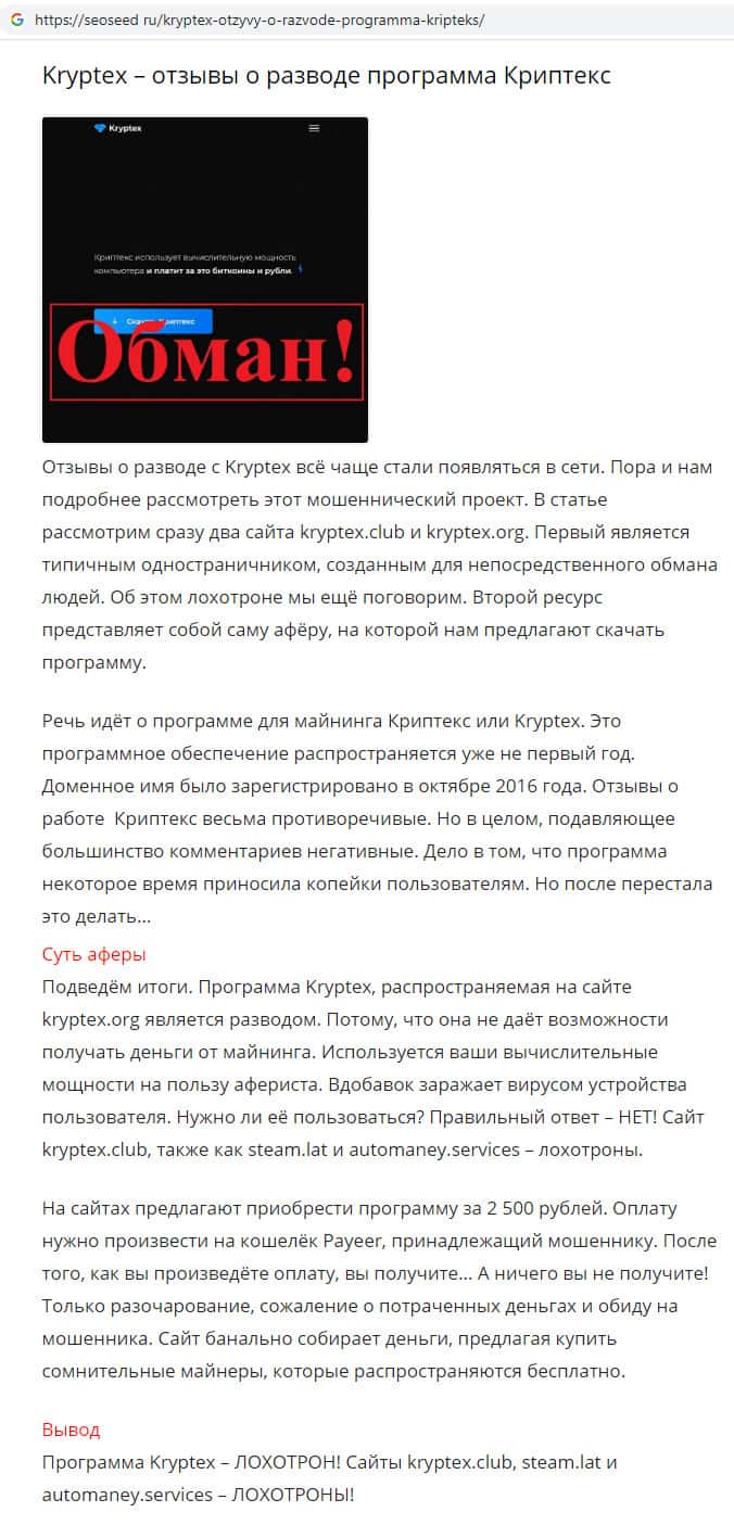 На информационном интернет-сервисе seoseed ru обнаружена статья об обмане со стороны мошенников Kryptex Org. Жулики обещают прибыль из неоткуда, якобы используя мощность компьютера. На самом деле это вирусная программа, которая Вам никакой прибыли не принесет !!!
