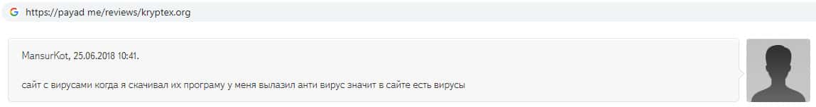 На веб-сайте payad me найден отзыв о жуликах Kryptex Org, автор которого пишет, что при попытке скачать предлагаемую ими программу сработал антивирусник. Необходимо быть осторожными и скептически относиться к подобным программам. Возможно программа Криптекс разработана специально для уничтожения персонального компьютера.