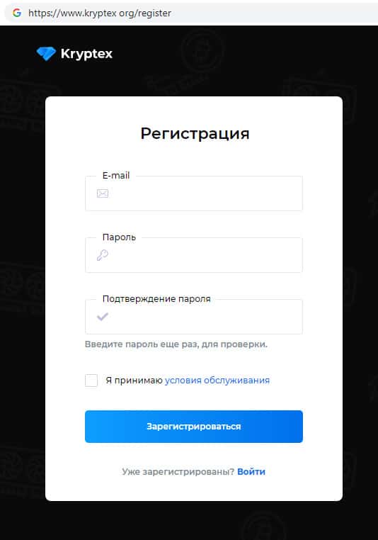 Для того, чтобы зарегистрироваться на сайте мошенников Kryptex Org необходимо назвать логин, адрес электронной почты и пароль, и конечно же подтвердить то, что Вы соглашаетесь с условиями пользования сайтом. Прежде чем поставить галочку в данной форме, подумайте стоит ли так рисковать своими деньгами?