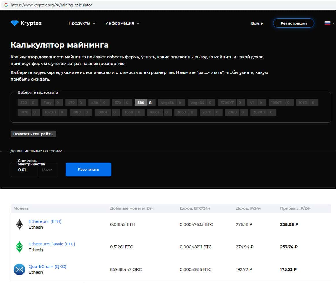 Аферисты Kryptex Org создают иллюзию свободы выбора предлагая пользователям их сайта таблицу с перечнем видеокарт для майнинга. От Вашего выбора на самом деле прибыль не зависит потому, что все зависит от мощности самого компьютера. Но торговля все равно будет убыточной, поскольку за электричество придется заплатить в разы больше.