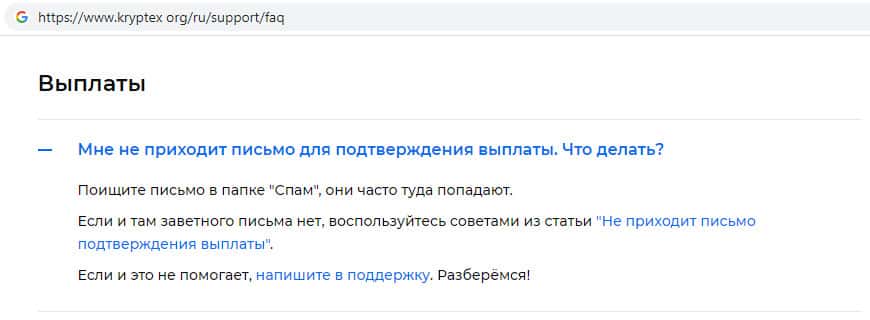 Согласно тому, что указывают мошенники Kryptex Org о выплатах, на почтовый ящик пользователю должно прийти письмо для подтверждения выплаты, чего зачастую не происходит. В папку спам часто попадают письма от Криптекс по той причине, что система определяет их как мошенников.