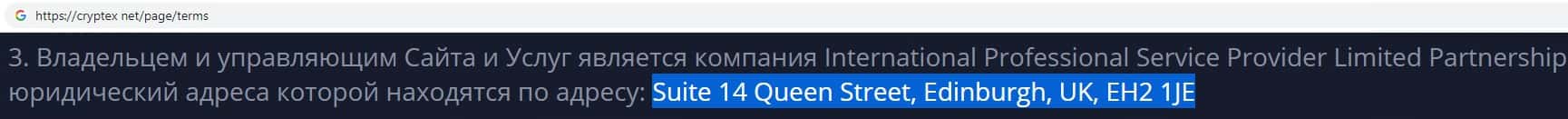 Сведения о месте регистрации Криптекс Нет фальшивы, так как большинство скам-проектов у себя на сайте указывают адрес городе Эдинбург для приманки очередного лоха.