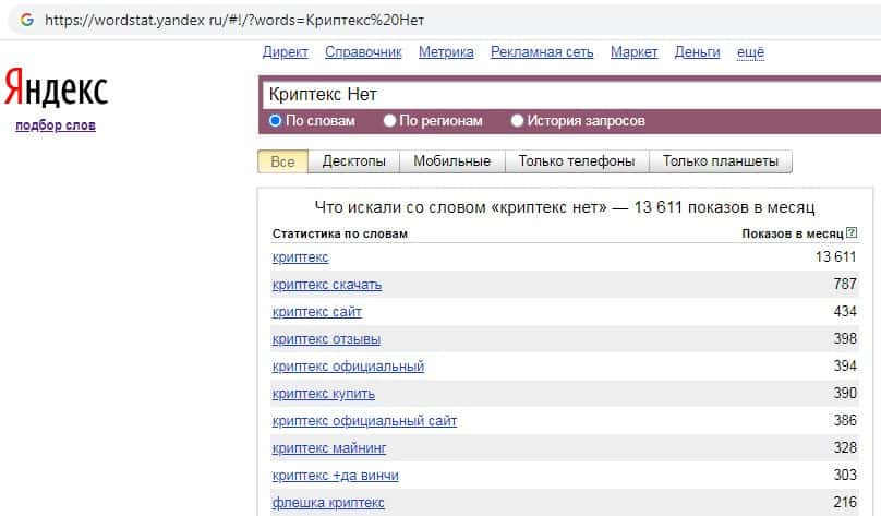 Количество брендовых запросов Криптекс Нет в поисковике Yandex