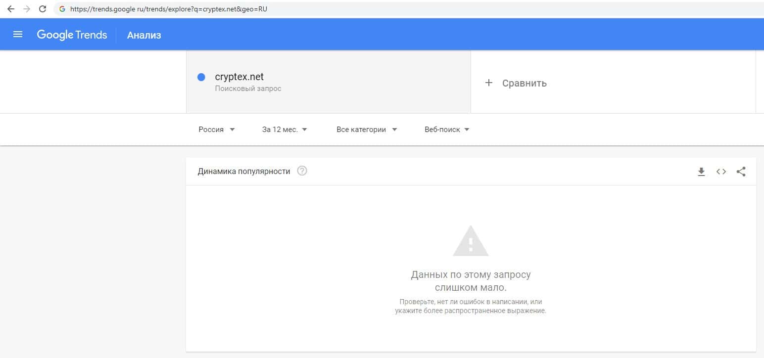 Вероятно на Гугл Трендс никто из пользователей не искал бренд названия компании на русском языке с пробелом "Криптекс Нет".