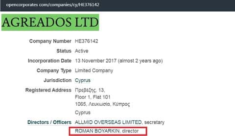 Далее предлагаем увидеть сведения о руководителях юридического лица Agreados LTD, под управлением которого находится scam-проект Криптерум. Также прошу заметить, что в реальности, скорее всего, указанный в источнике управленец является подставным лицом, которое в действительности не руководит лохотроном Crypterum.