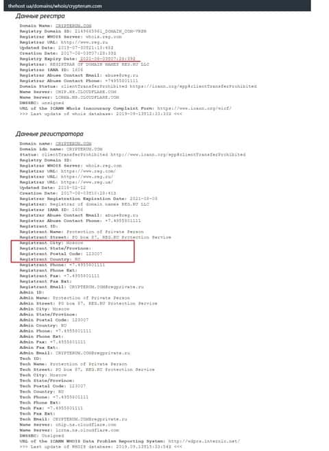 Далее приводим подробную информацию о регистрации домена crypterum com, срок действия регистрации которого заканчивается в 2021 году. Как для солидной организации, такие сроки - ничего. Также стоит обратить внимание на принадлежность регистратора к Российской Федерации. Поэтому вывод один: Криптерум - очередной scam-проект по разводу населения РФ.