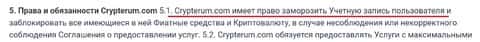 Далее предлагаю ознакомится с перечнем подставных правил в главном нормативно-правом акте онлайн-лохотрона Crypterum. Данные нормы и создают все необходимые условия, дабы мошенники Криптерум могли вблизи законодательства разводить на деньги наивных пользователей всемирной паутины.