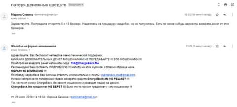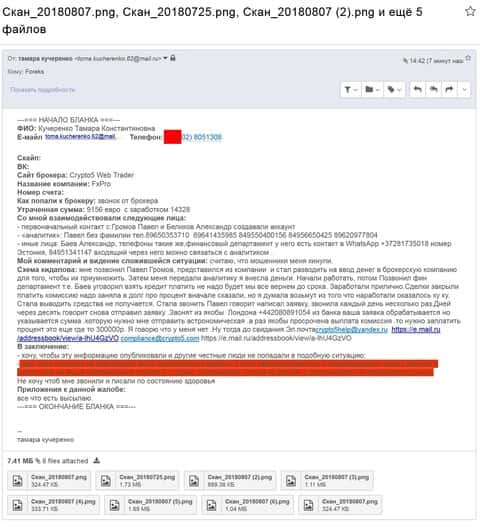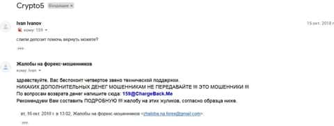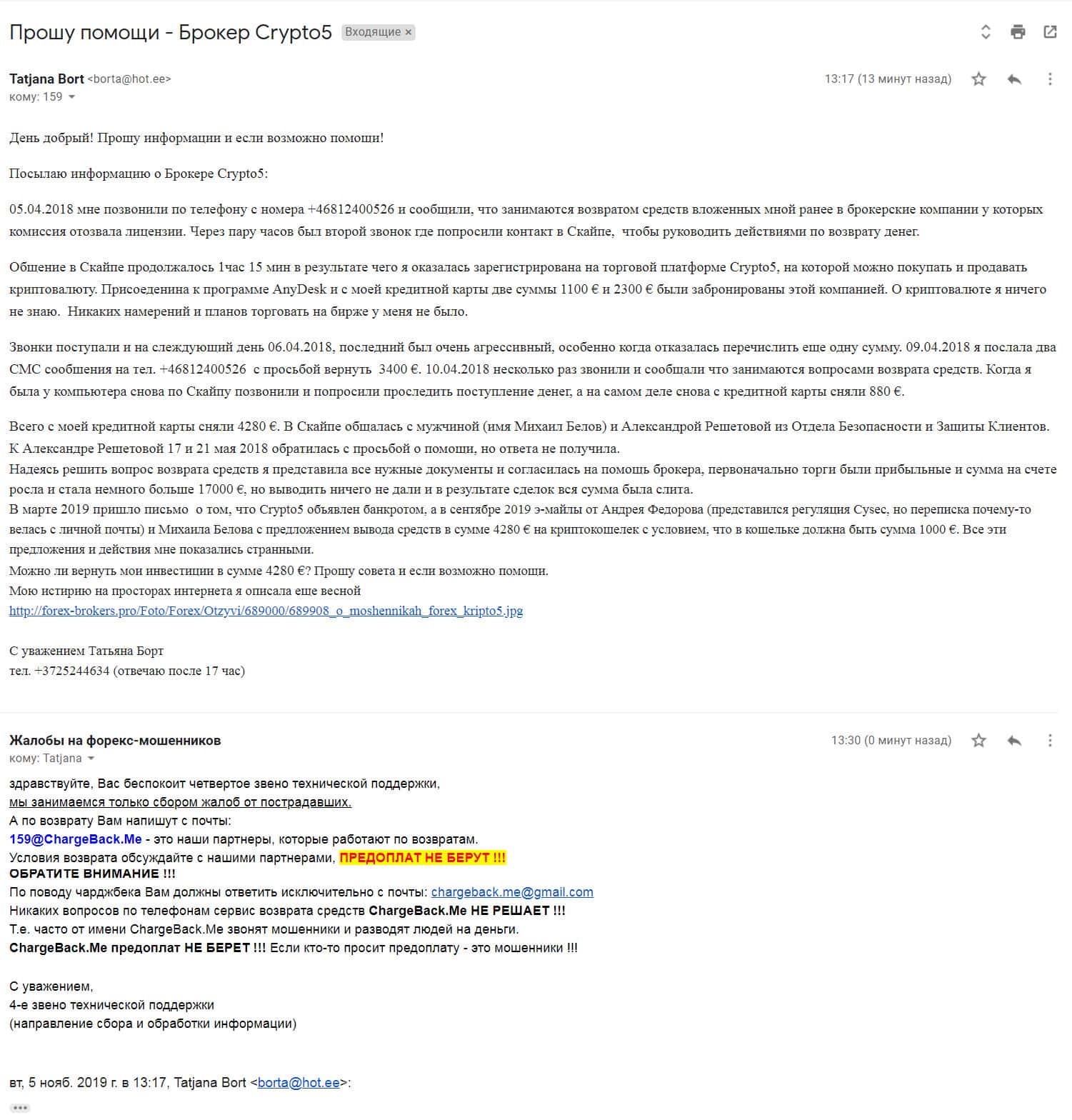 В данном письме женщина рассказала все в подробностях, касательно ситуации с кидаловом со стороны лохотрона Крипто 5. Аферисты вышли на нее через якобы чарджбечную компанию, которая занимается возвратом утерянных средств. Но и в данном случае помощники оказались типичными аферистами.