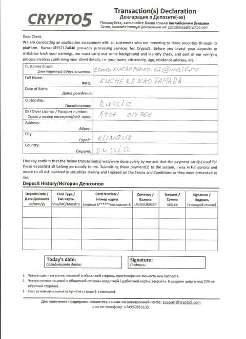 Очередная жертва мошенников Крипто5 на сумму 6000 евро