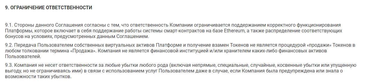 Аферюги CryptoArt с успехом делают две вещи: заговаривают зубы своим клиентам и снимают с себя ответственность за будущие потери этих клиентов. Как делается первое, вы уже видели выше. Второе же делается с помощью договора, в котором жулики Крипто Арт снимают с себя ответственность за убытки клиентов.