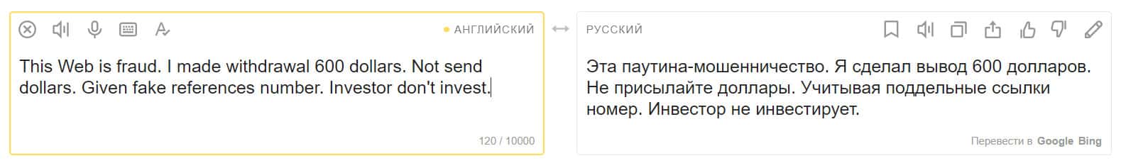 Далее вы видите перевод отзыва Эдисона, который также пытался инвестировать средства в торговлю криптовалютой. В результате он не смог получить ни профит, ни заведенную на депозит сумму.