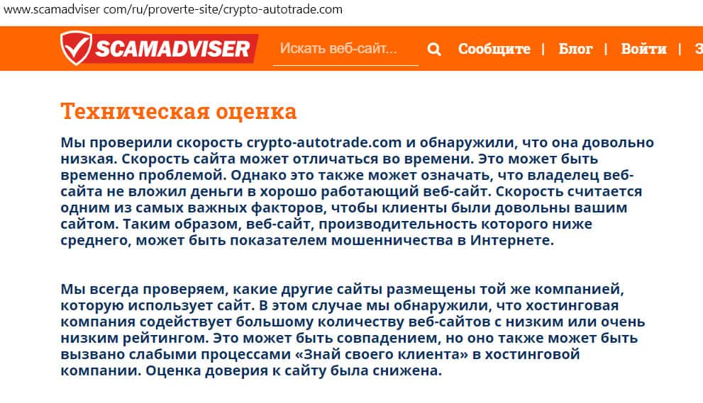 Проанализировав техническую сторону работы Крипто Авто Трейдера, специалисты из Скамадвайзера пришли к выводу, что это недобропорядочная компания, обманом вовлекающая людей в торговлю криптовалютой. Особенно подозрительным моментом считается то, что у компании нет определенного хостинга.