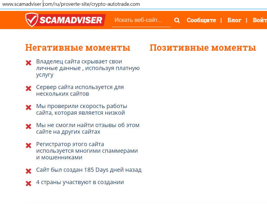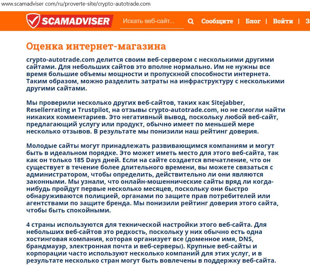 Сайт под названием Скамадвайзер занимается идентификацией он-лайн мошенничества с помощью определенных алгоритмов. Исследовав Крипто Авто Трейдер, авторы Скамадвайзера пришли к выводу, что вышеуказанная площадка - обычный лохотрон.