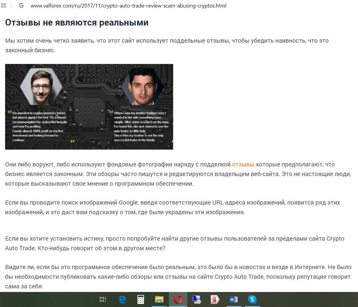 По мнению Valforex, все отзывы, представленные на сайте Крипто Авто Трейдер, являются поддельными. Это и понятно, ведь обманутые ими клиенты не стали бы оставлять позитивных комментариев. Сотрудники Valforex считают, что все отзывы написаны владельцами Крипто Авто Трейдер, а фотографии украдены с просторов интернета.