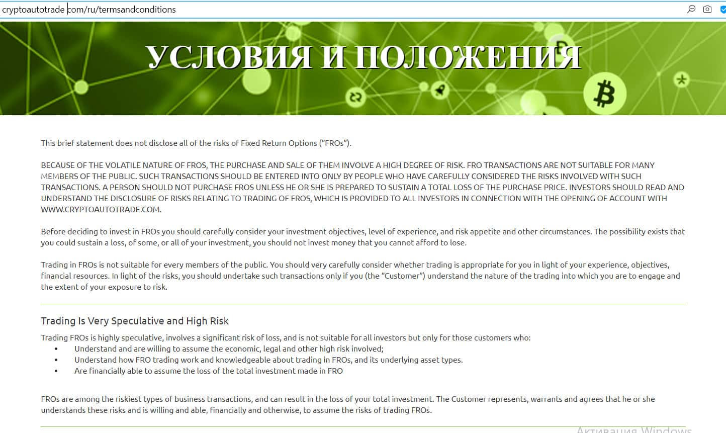 Вот о чем говорится в разделе Условия и положения сайта Крипто Авто Трейдер. Клиенты должны понимать, что торговля криптовалютой сопряжена с высокими рисками. А также, инвесторы должны быть готовы потерять все свои средства.