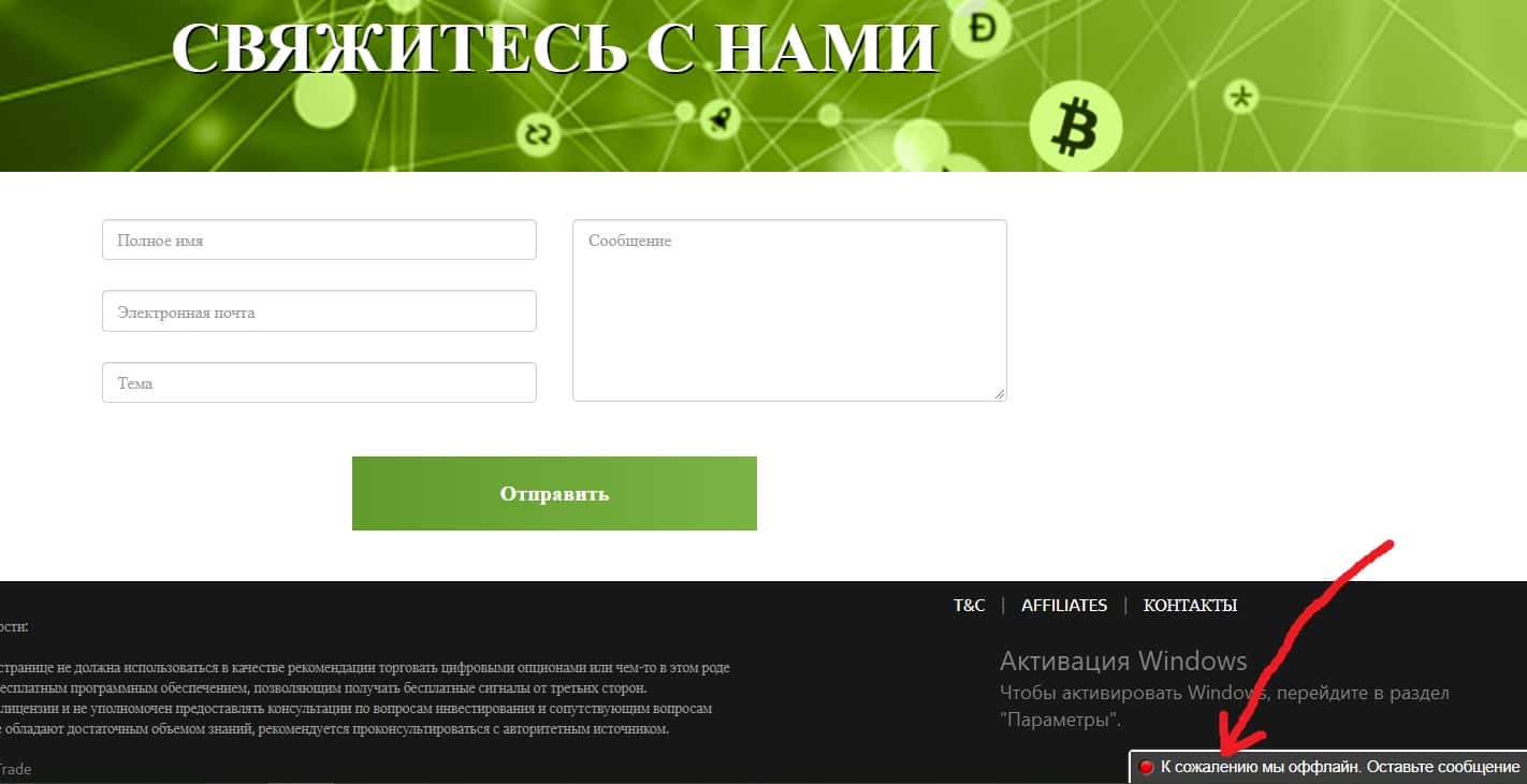 Раздел Контакты на сайте мошенников существует, однако вы не сможете начать чат с техподдержкой, если в этот возникнет необходимость. В самом низу страницы видно сообщение о том, что ТП всегда оффлайн. Но вы можете попробовать написать им на эл. почту. И не будет ничего удивительного, если ответа вы так и не дождетесь!
