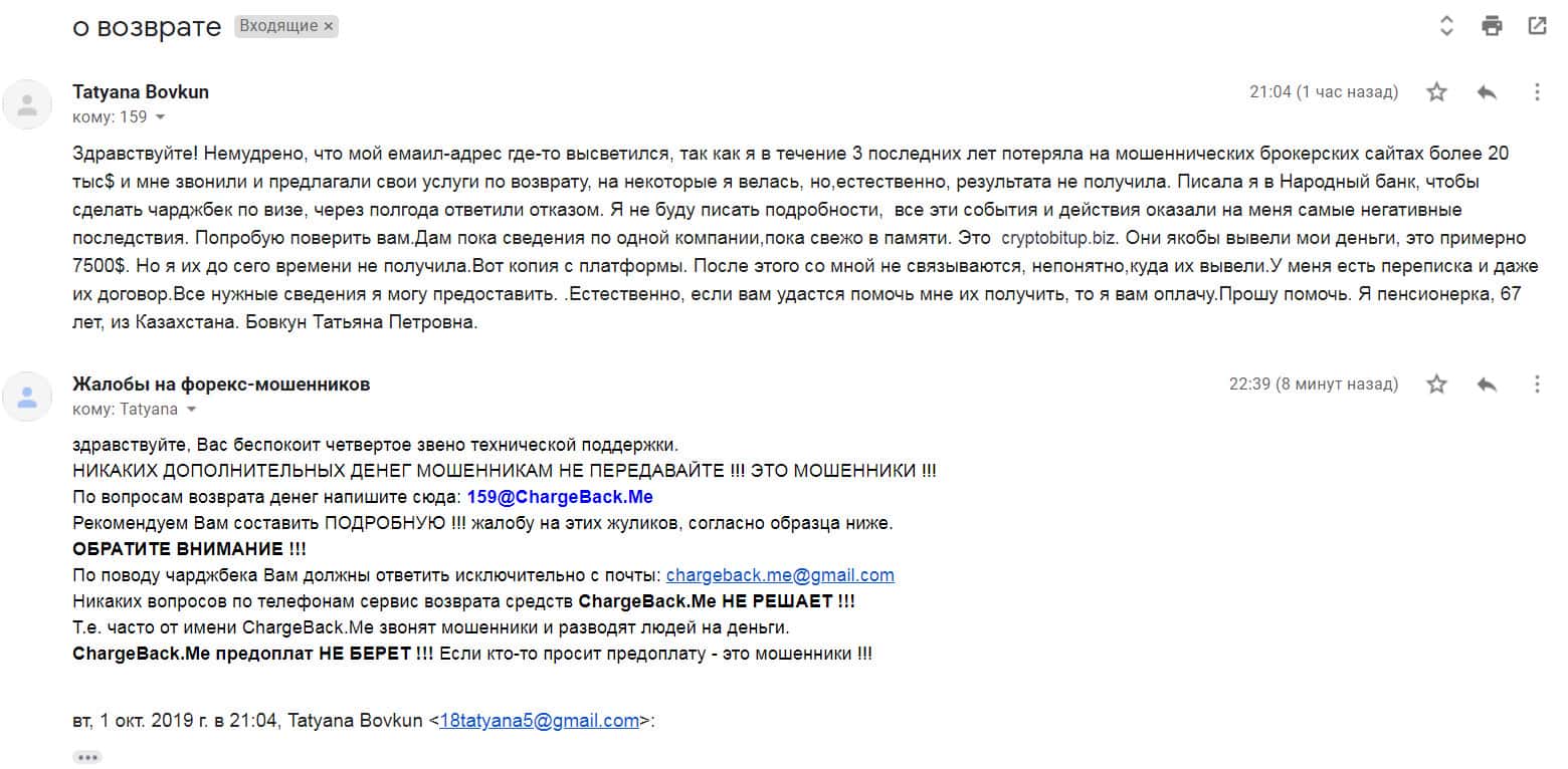 Женщина рассказала в подробностях, как она борется до сих пор с аферистами Крипто Бит. До того она попадалась и к другим мошенническим конторам, которые кинули ее на общую сумму в 20 000 долларов. Но самую большую аферу провела именно этот лохотрон, который умудрился вытащить кусок в размере 7500 долларов.