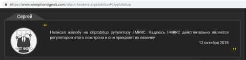 Вкладчик, потерявший наверняка немалую для него сумму на площадке-лохотроне Крипто Бит, даже написал жалобу в компанию-регулятор FMRRC. Пользы это, естественно, не принесет, ведь пройдохи обезопасили себя со всех сторон, и российский регулятор к ним отношения не имеет.