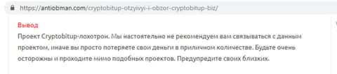 Отлично выучив многочисленные жалобы и отрицательные отзывы о работе показушников из Крипто Бит, специалисты Ассоциации резюмировали следующее: это стопроцентный лохотрон и фейковый брокер, кухонная контора, связываться с коей очень рискованно для вашего кошелька.