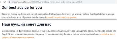 На этом портале также не рекомендуется иметь дел с шарашкой CryptoBit. Разбор полетов написан на английском языке, чтобы предостеречь англоязычную публику от посещения скам-платформы Крипто Бит, и сотрудничества с ними.