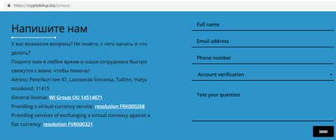 На портале скаммеров из Крипто Бит не найдено даже контактных телефонов. Все, что тут имеется – их подставной адрес в Эстонии, и форма для тех, кто хочет отправить свой вопрос. Вот только, судя по отзывам потерпевших, отзываться на жалобы клиентов никто не будет. И то не удивительно, зачем обращать внимание на уже отработанных лохов, подаривших шулерам баблишко за просто так.