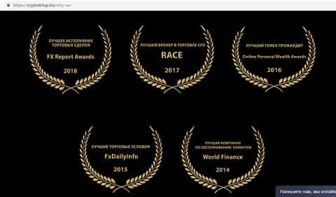 Сомнительны хвалебные оды, которые аферисты из Крипто Бит просто придумали сами себе. Ни одна из этих наград не подтверждается. Очевидно, что весь сайт рассчитан лишь на дурачков, ищущих легкой наживы в сети. Как только они попадут в сети мошенников, и внесут на их сайт деньги, пиши пропало - ни копейки не получится вывести с этой платформы.
